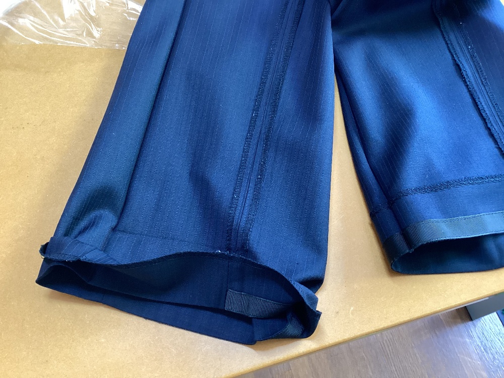 スラックスやパンツの裾をスクイ縫い(まつり)で処理している事が多いです。仕上がりは糸目が見えず綺麗ですが、解れ易い事が欠点です。